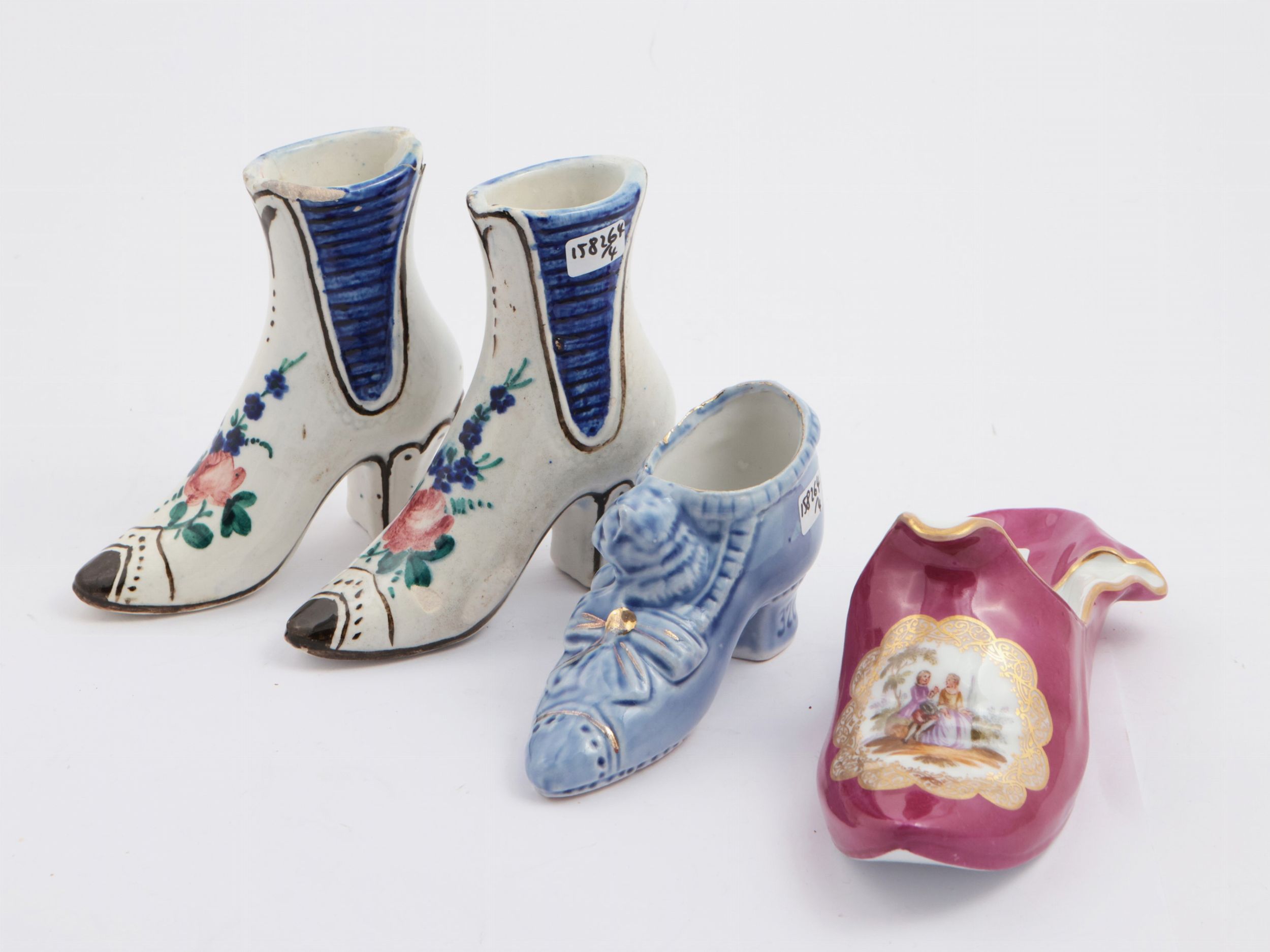 Quattro scarpette portafortuna in ceramica, prima metà del XX secolo