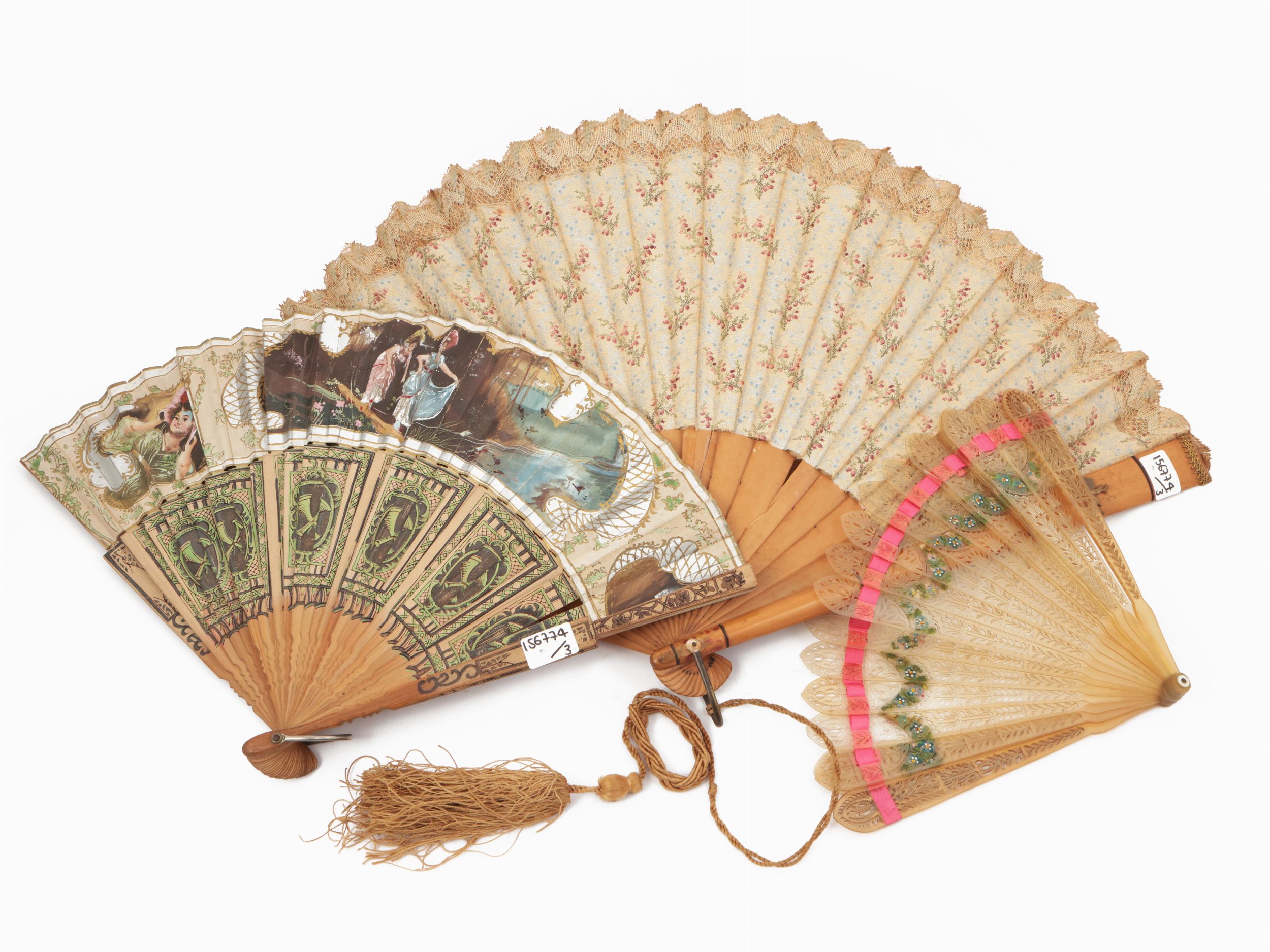 da cm 16x29 a cm 28x53 (3) tra cui uno con pagina in tessuto con fantasia di piccoli fiori rossi, dettagli in pizzo e stecche in bambù con applicazione in metallo dorato ed un altro piccolo realizzato interamente in bachelite traforata con motivo floreale e dipinto con festone, alcuni difetti