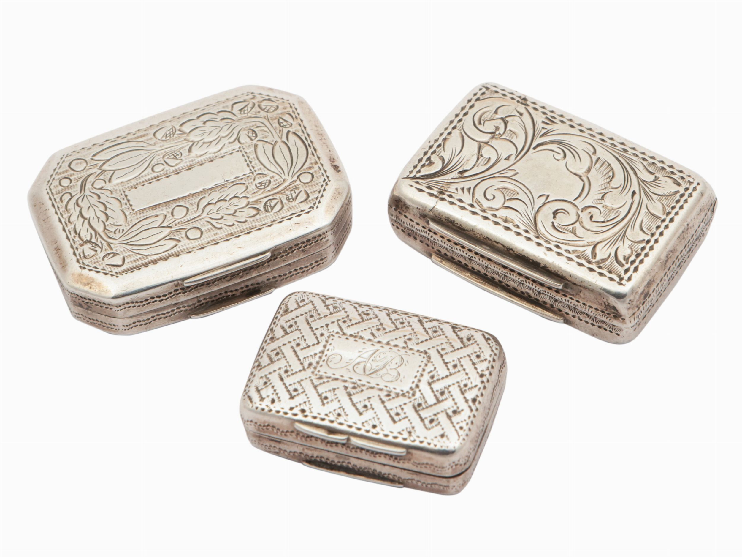 Tre vinaigrette in argento da collezione, Birmingham 1817, 1824, 1854