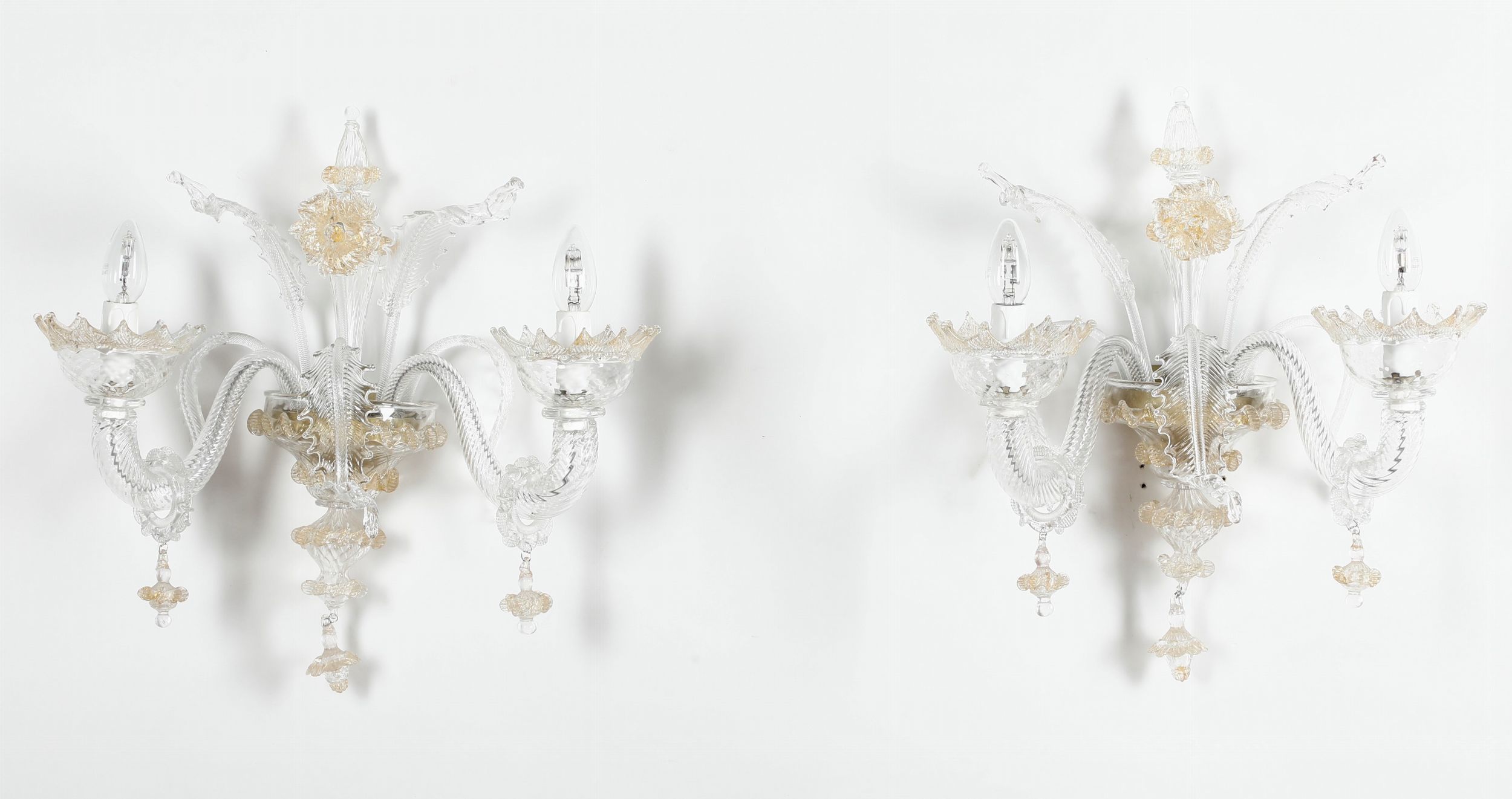 Coppia di appliques in cristallo di Murano bianco e oro a due braccia