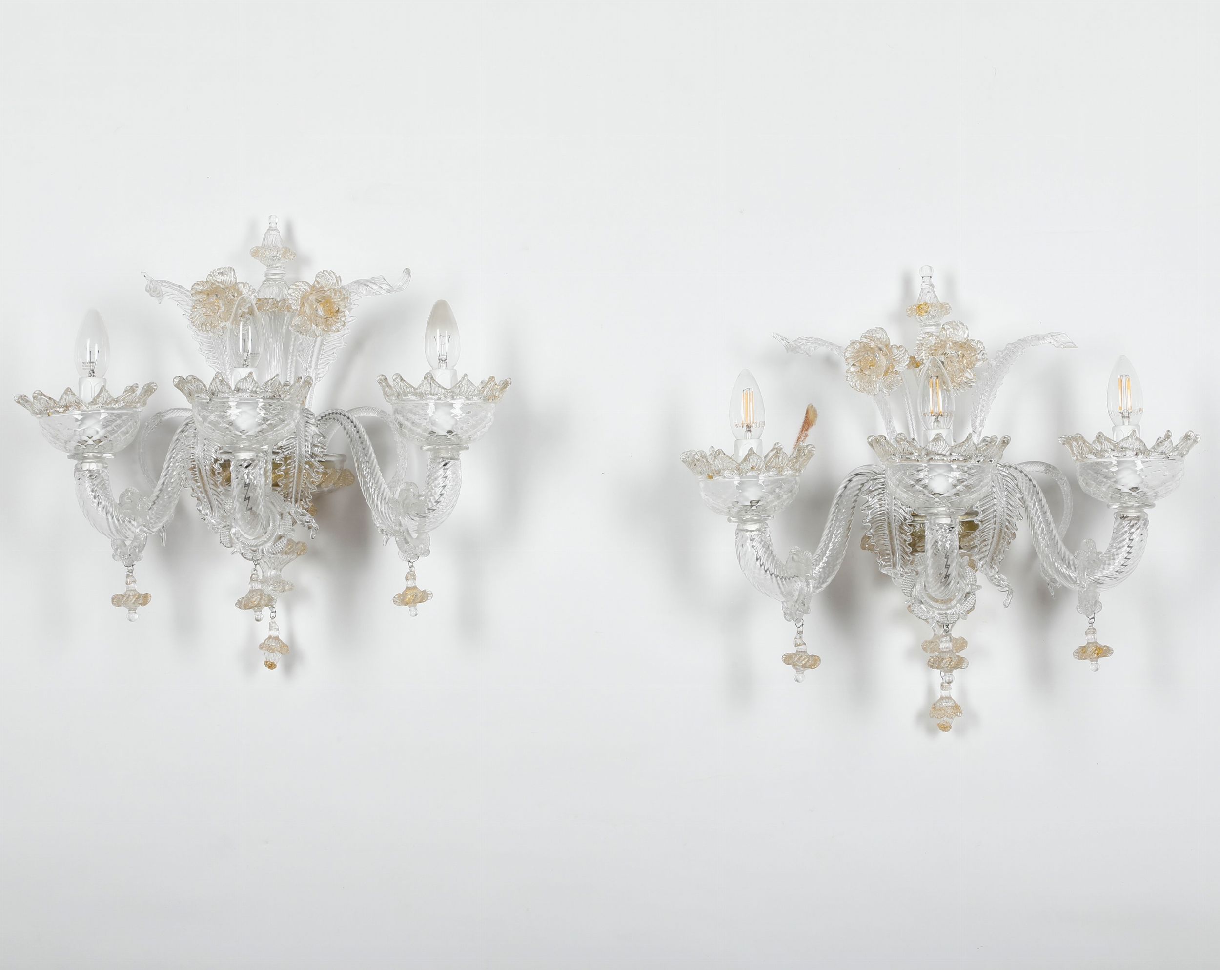 Coppia di appliques in cristallo di Murano bianco e oro a tre braccia