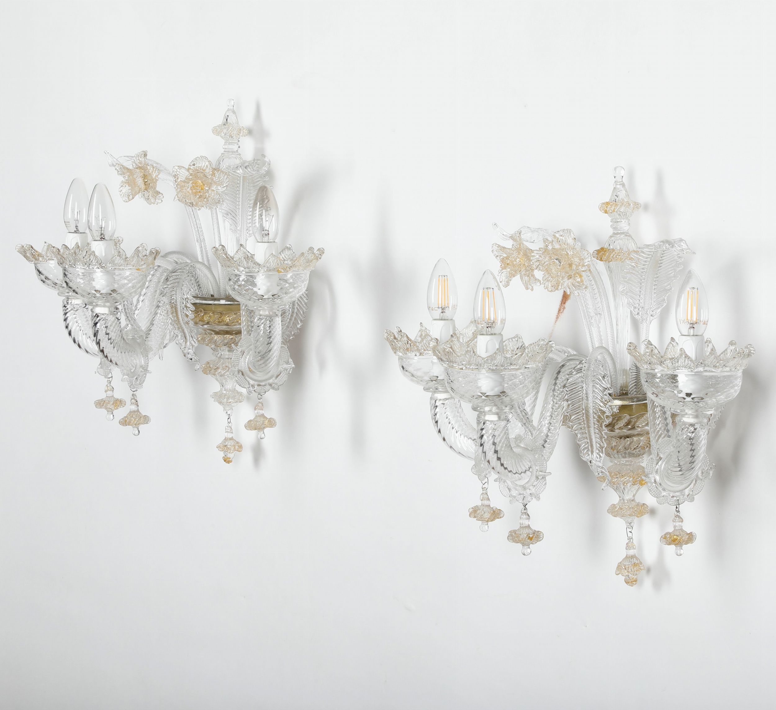 Coppia di appliques in cristallo di Murano bianco e oro a tre braccia