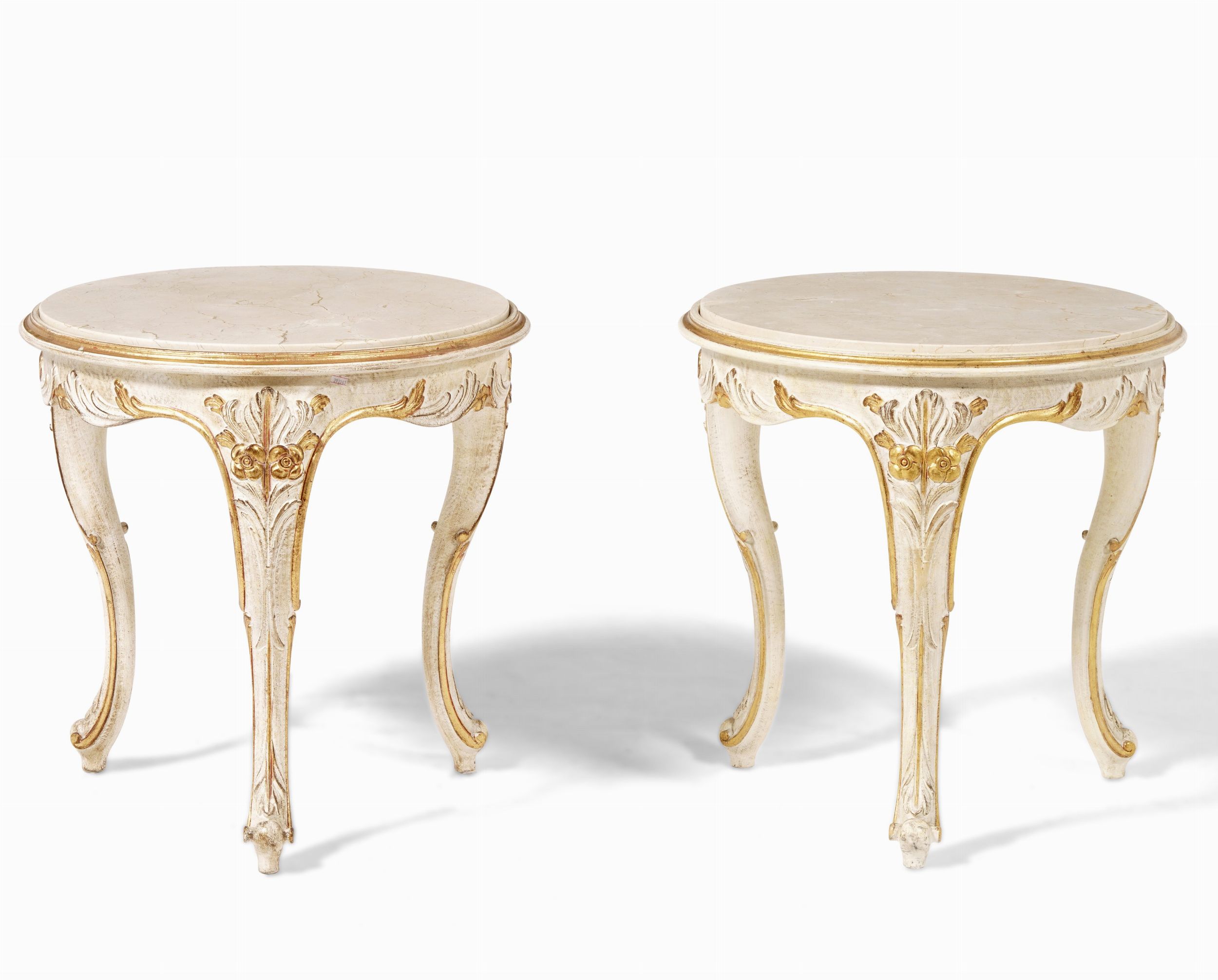 Coppia di tavolini in legno intagliato e dipinto e marmo. XX secolo