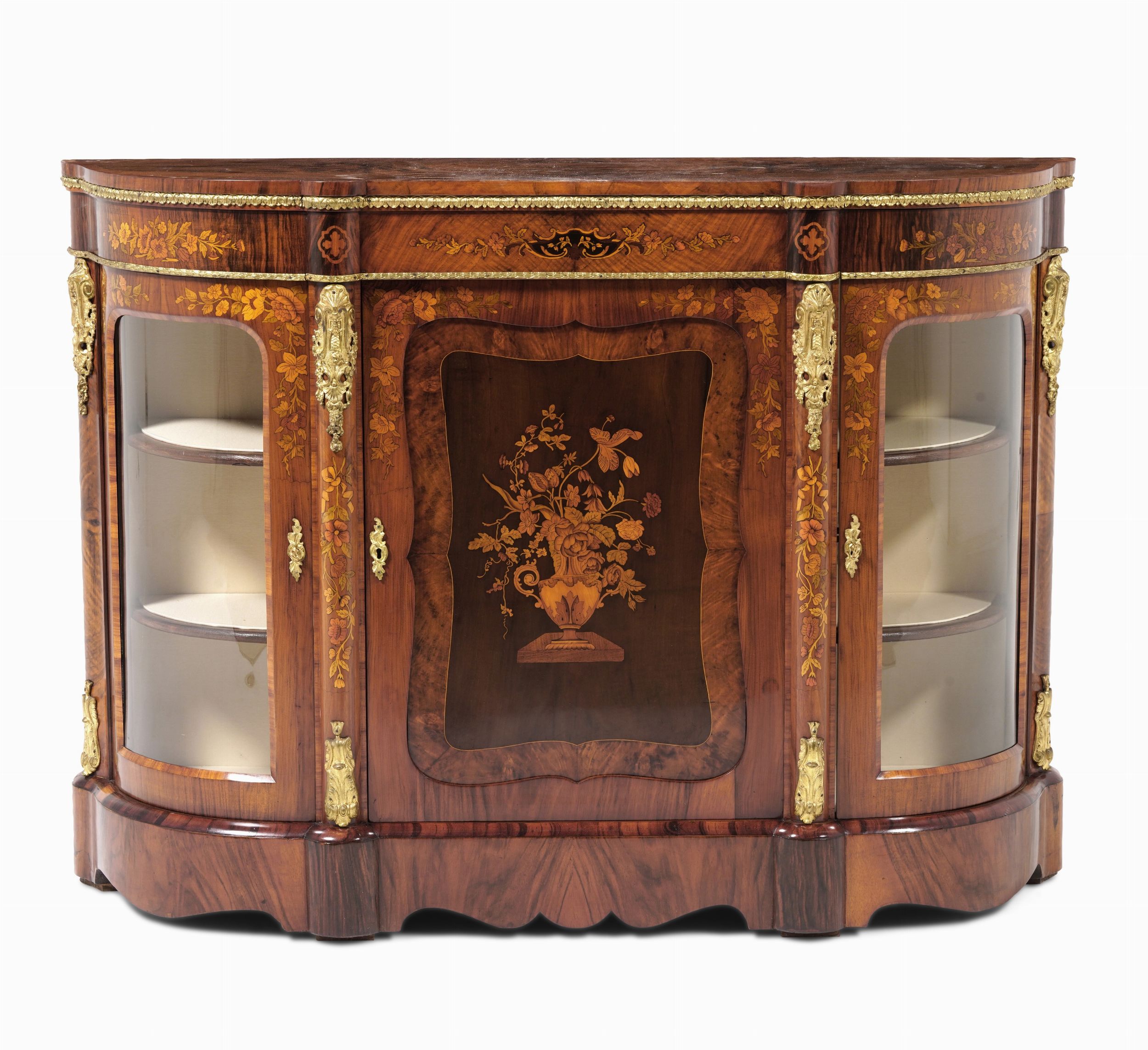 Credenza in legno lastronato ed intarsiato in varie essenze. XIX-XX secolo