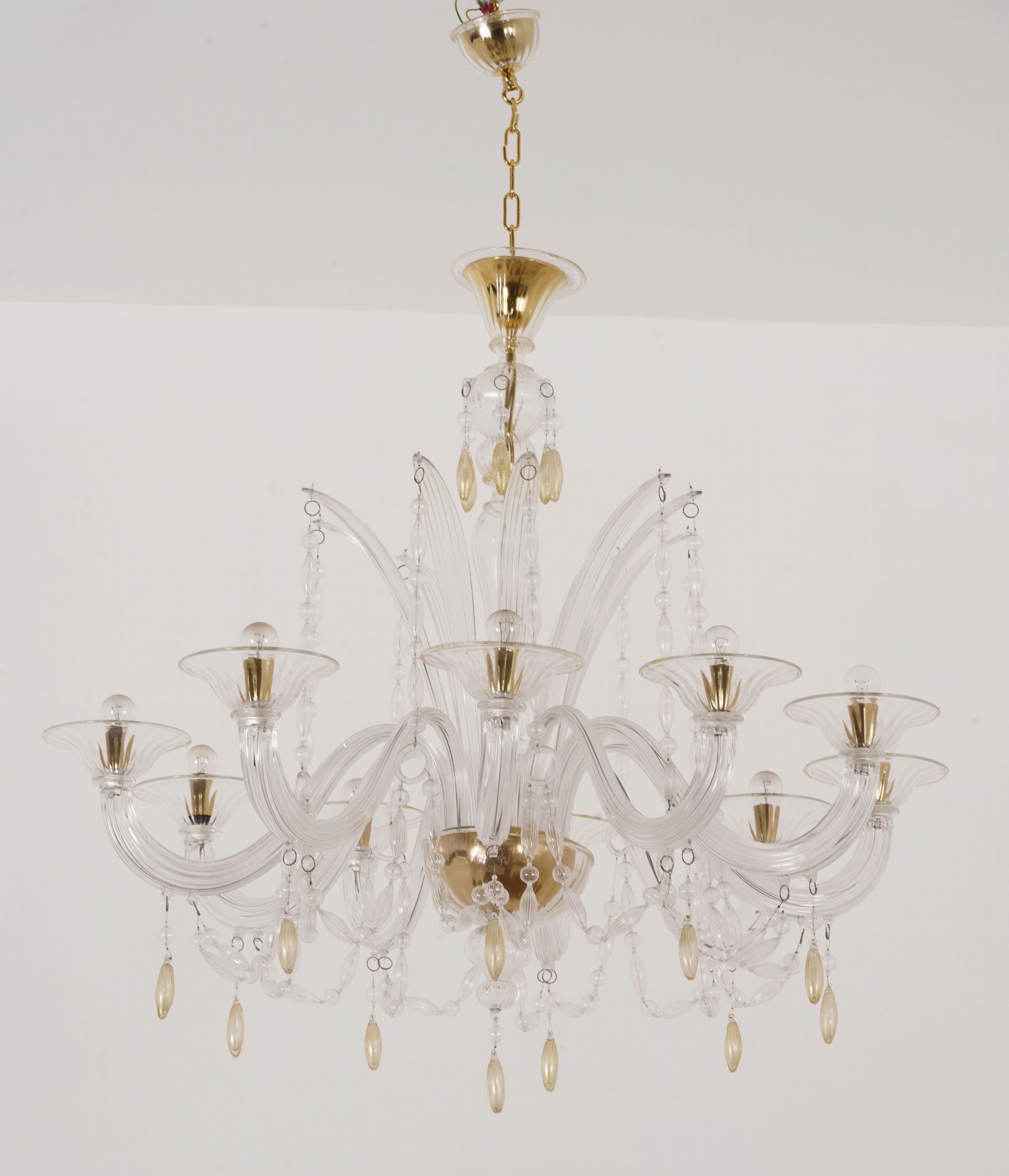 Lampadario a dieci braccia in cristallo di Murano bianco e oro