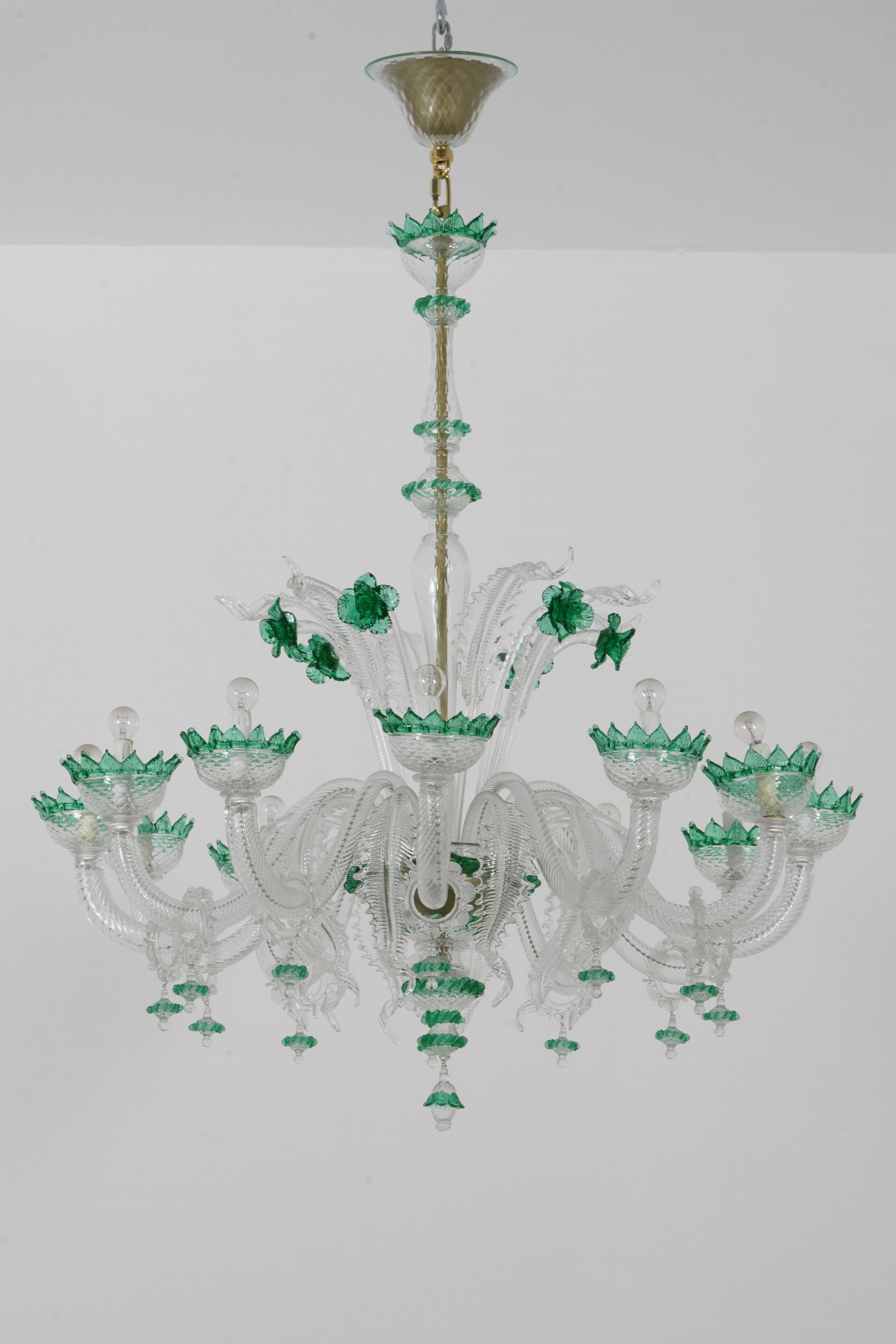 Lampadario a dodici braccia in cristallo di Murano bianco e verde