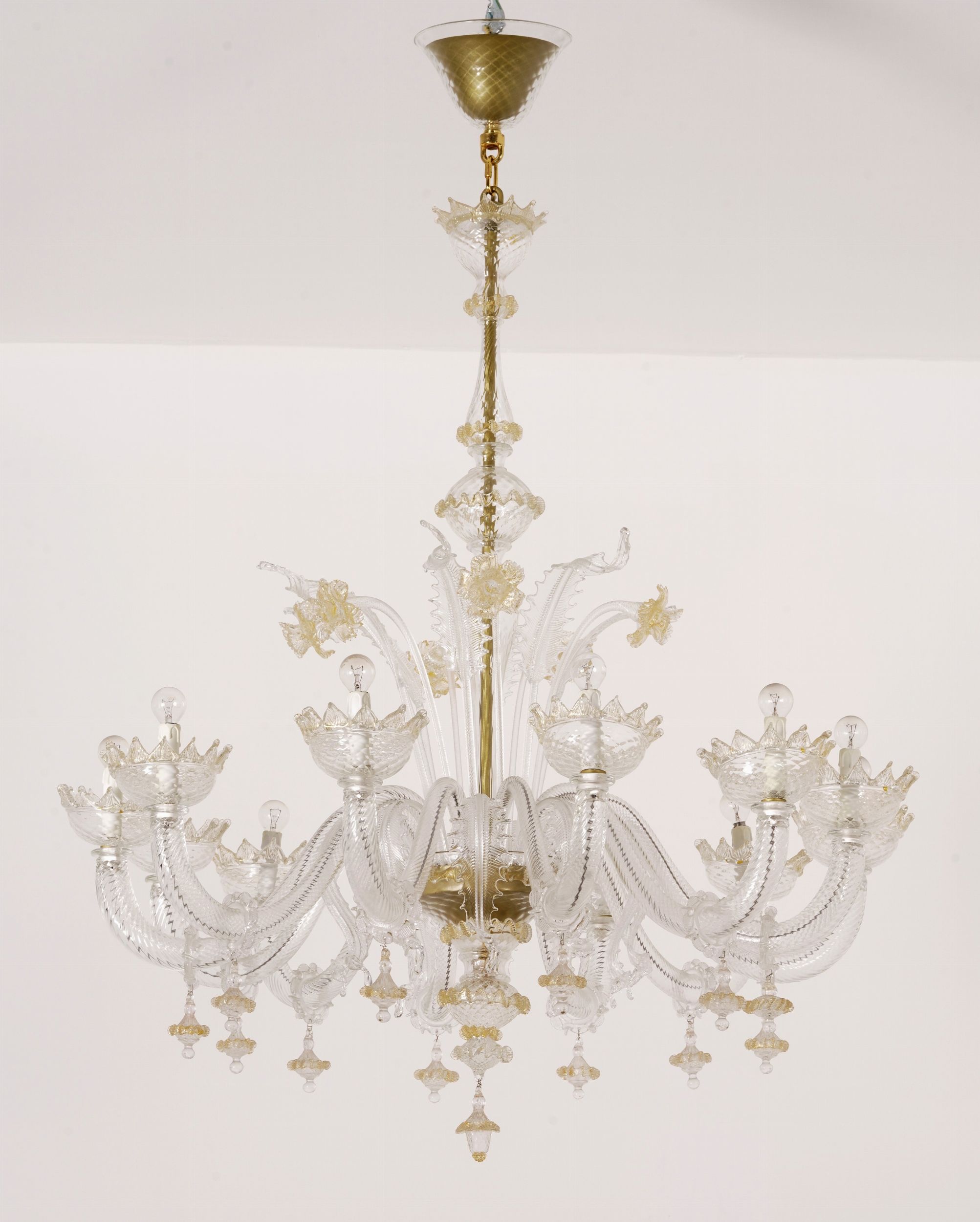 Lampadario a dodici braccia in cristallo di Murano bianco e oro