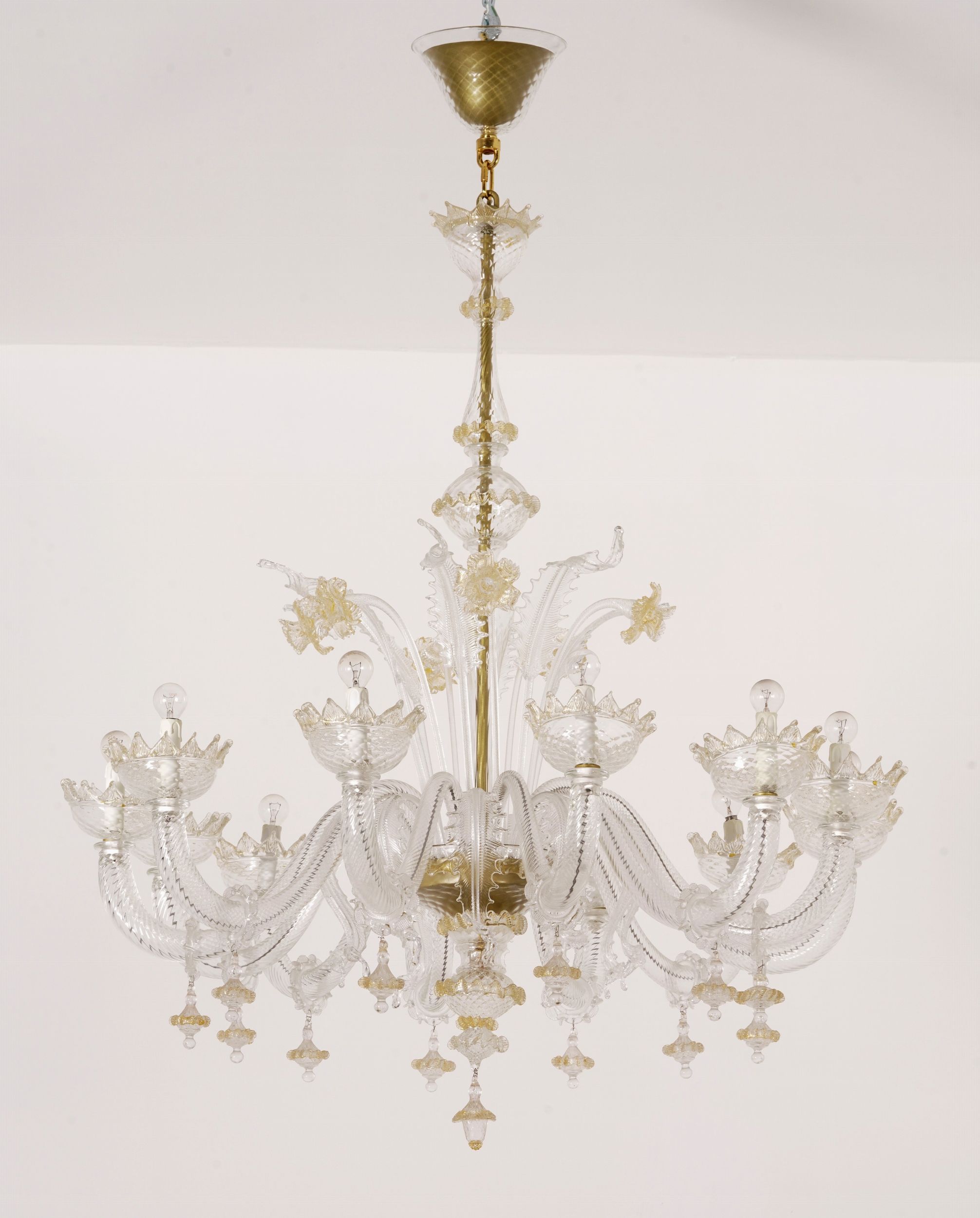 Lampadario a dodici braccia in cristallo di Murano bianco e oro