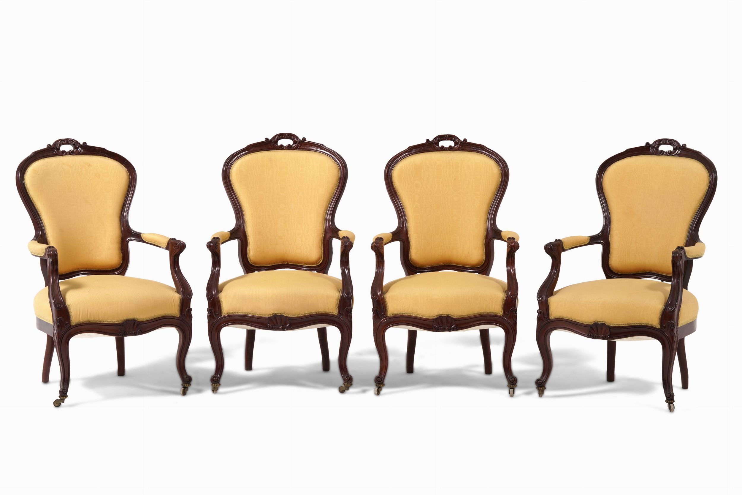 Lotto di quattro poltrone in legno e tessuto giallo, inizio XX secolo