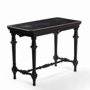 Tavolo in legno ebanizzato e decoro in bronzo e metallo dorato stile Boulle, Francia [..]