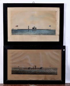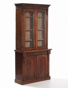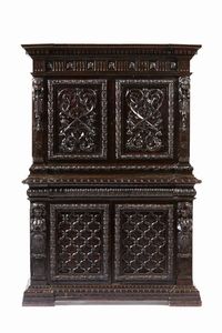 Credenza a due corpi in noce intagliato e scurito di gusto cinquecentesco. XIX-XX [..]