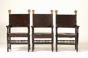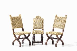Tre seggioloni in noce scurito. Italia meridionale, XVIII secolo