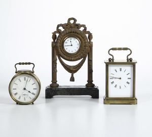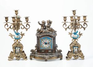 Trittico composto da pendola da tavolo e coppia di candelabri. Francia XX secolo