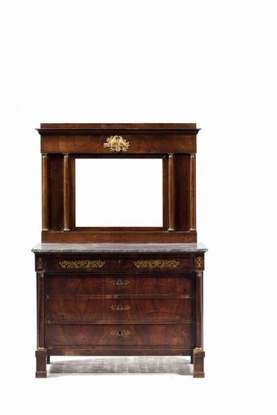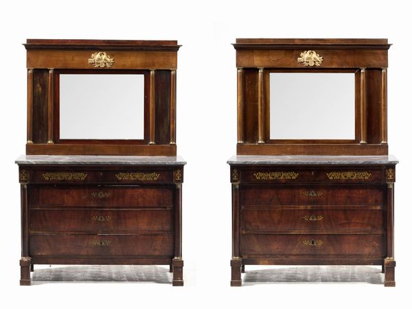 Coppia comò Impero con specchiere in legno lastronato ed intarsiato. XIX secolo
