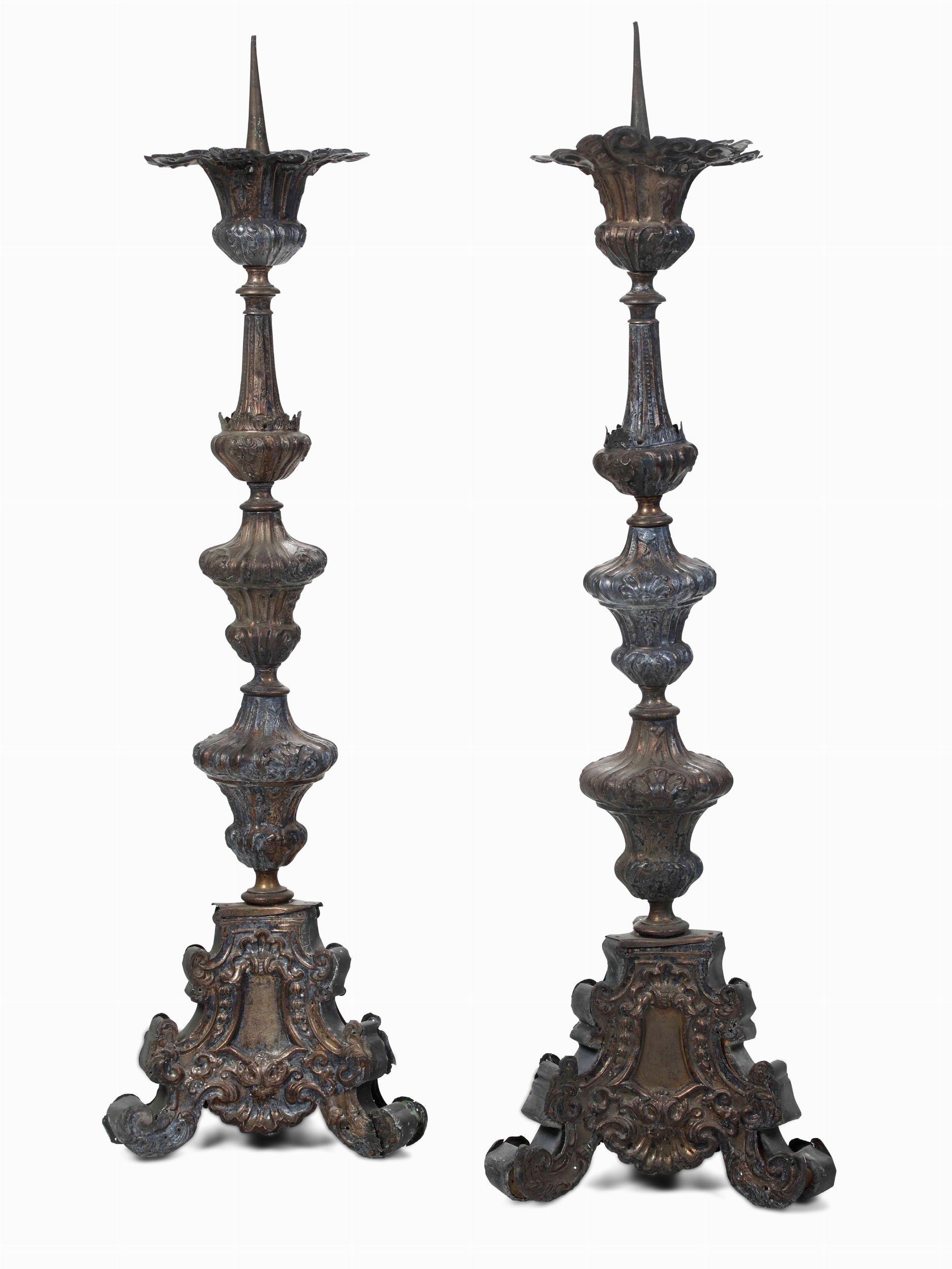 Coppia di candelieri in metallo sbalzato con struttura interna in legno. XVIII s [..]