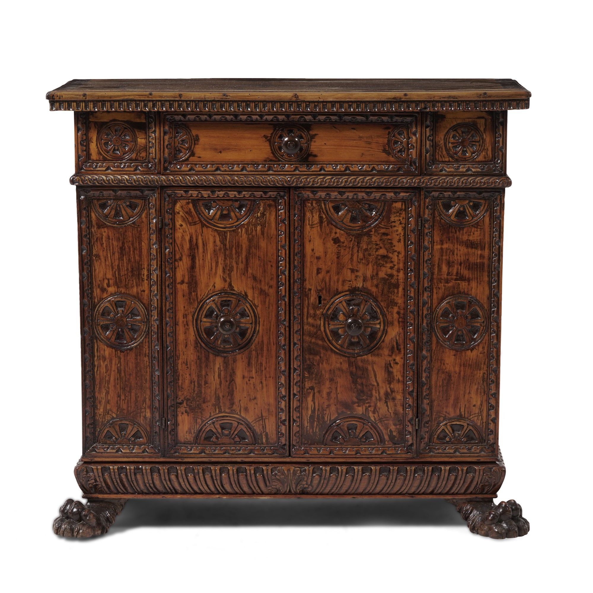 Credenza in noce con decorazione floreale intagliata, gambe ferine. Stile 700