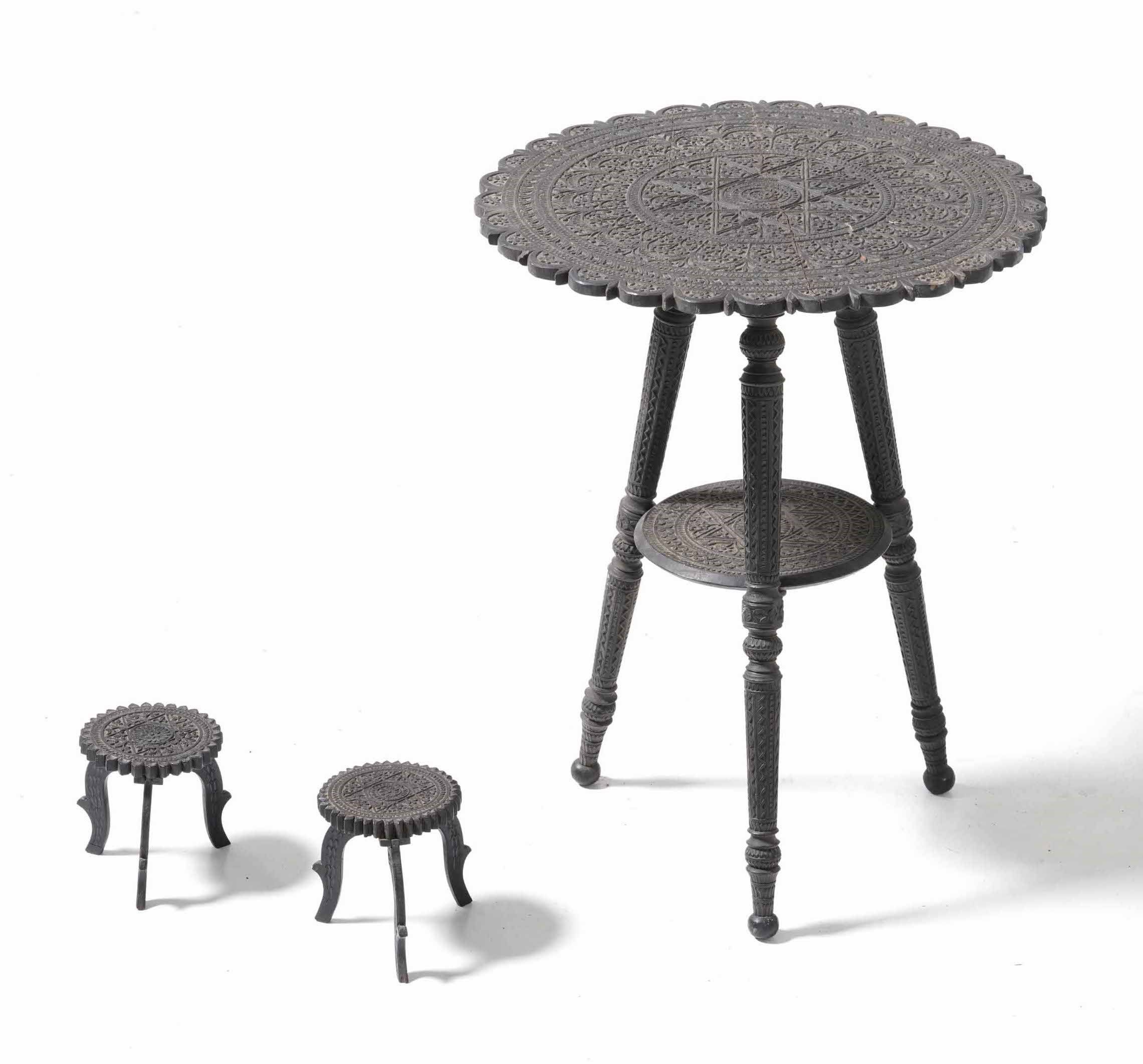 Lotto composto da un tavolino e due piccoli reggi vaso in legno ebanizzato e int [..]