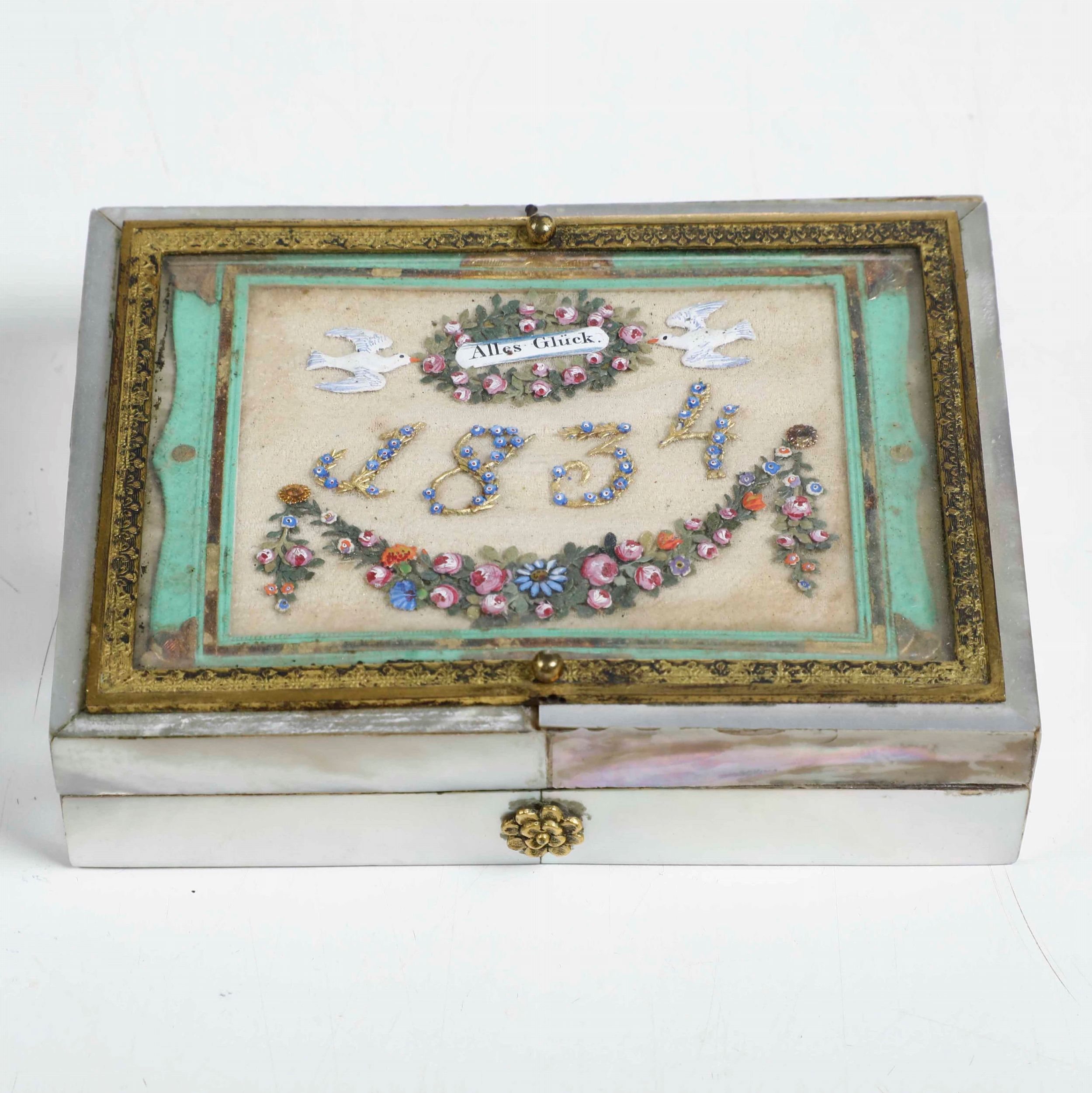 Scatola benaugurale per l’anno 1834. Vetro dipinto, bronzo dorato e madreperla. [..]