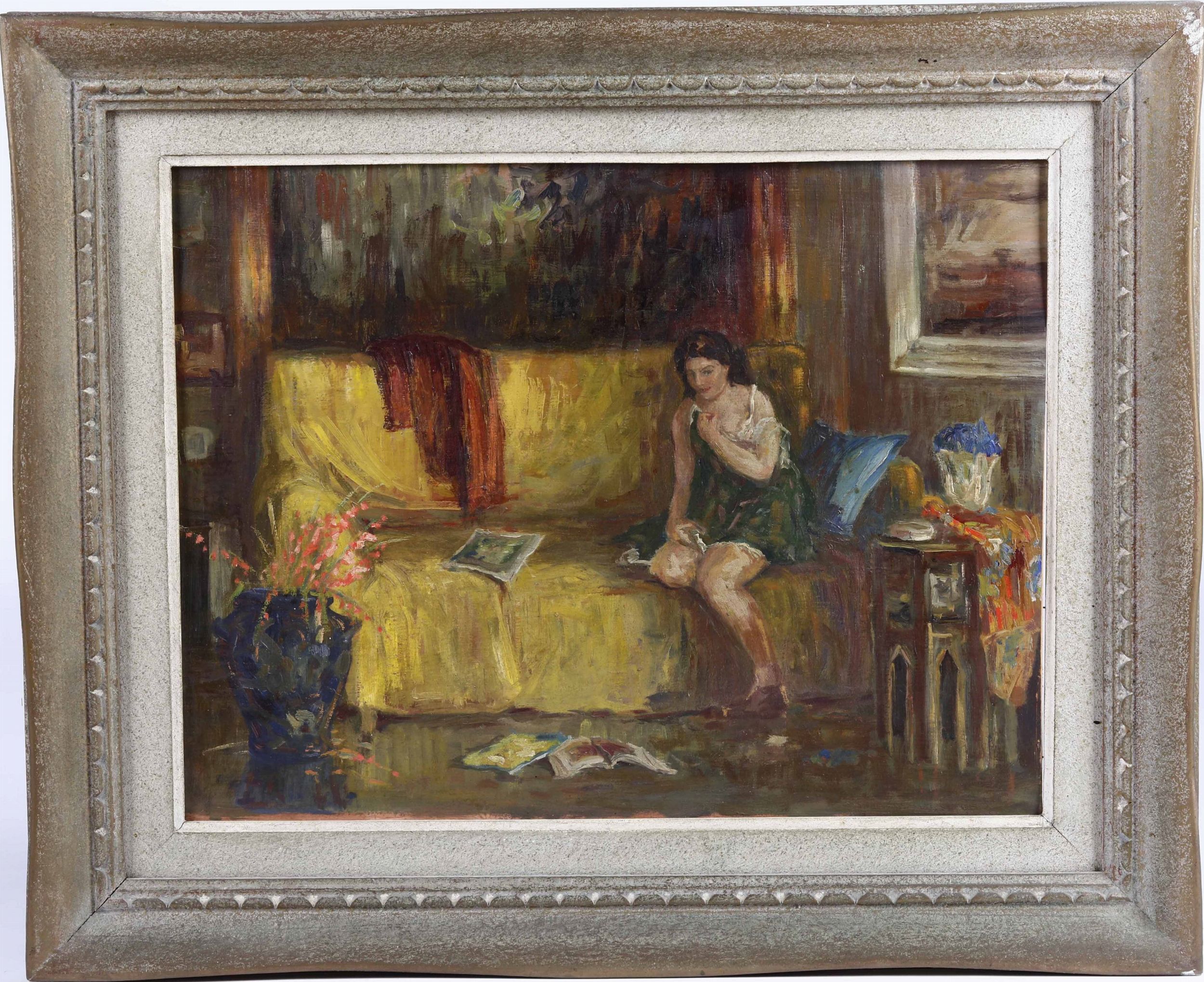 Anonimo XX secolo Interno con figura femminile sul divano
