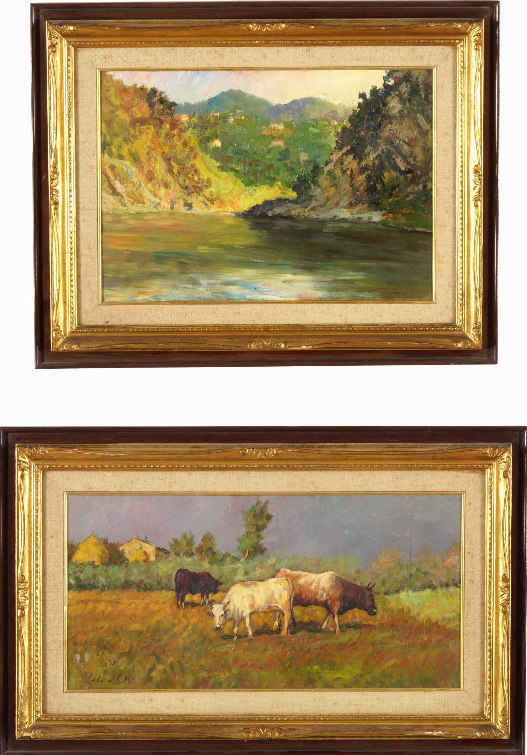 due dipinti ad olio su tavola Veduta di lago
