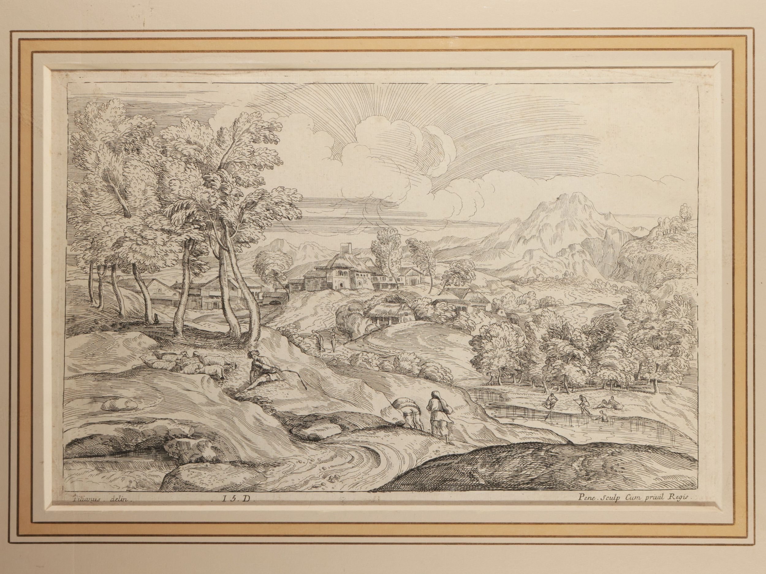 XVIII secolo cinque incisioni a punta secca, con passe-partout, tracce di foxing