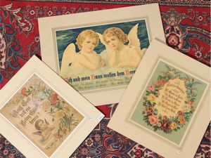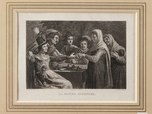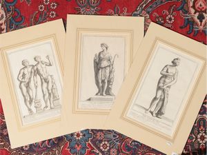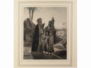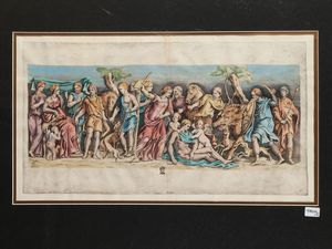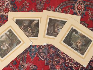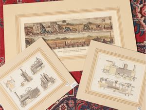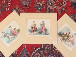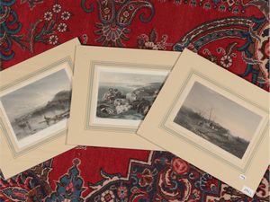 passe-partout cm 36,5x43,5 (3) XIX secolo tre incisioni su acciaio, colorate, con passe-partout, tracce di fo [..]