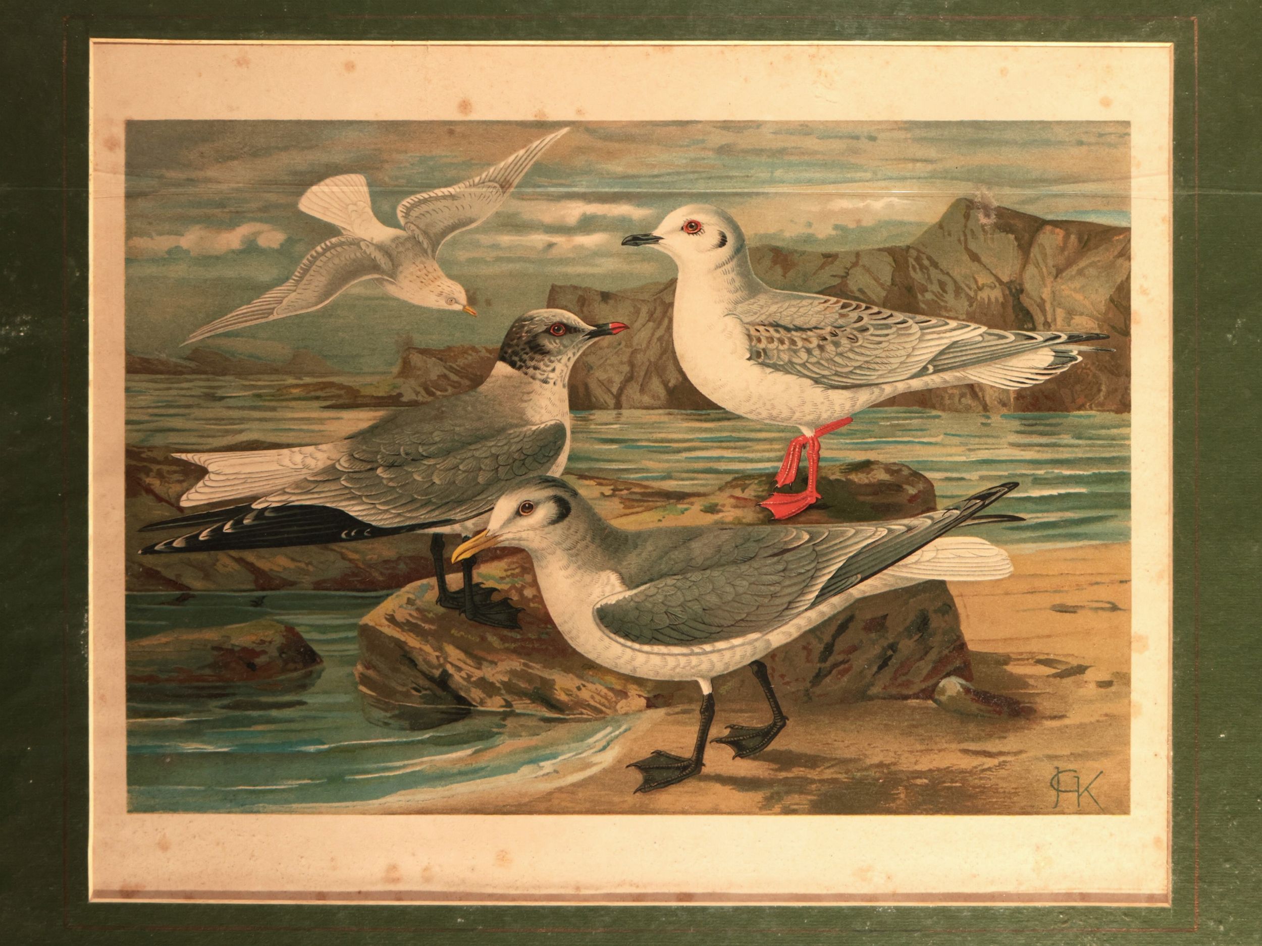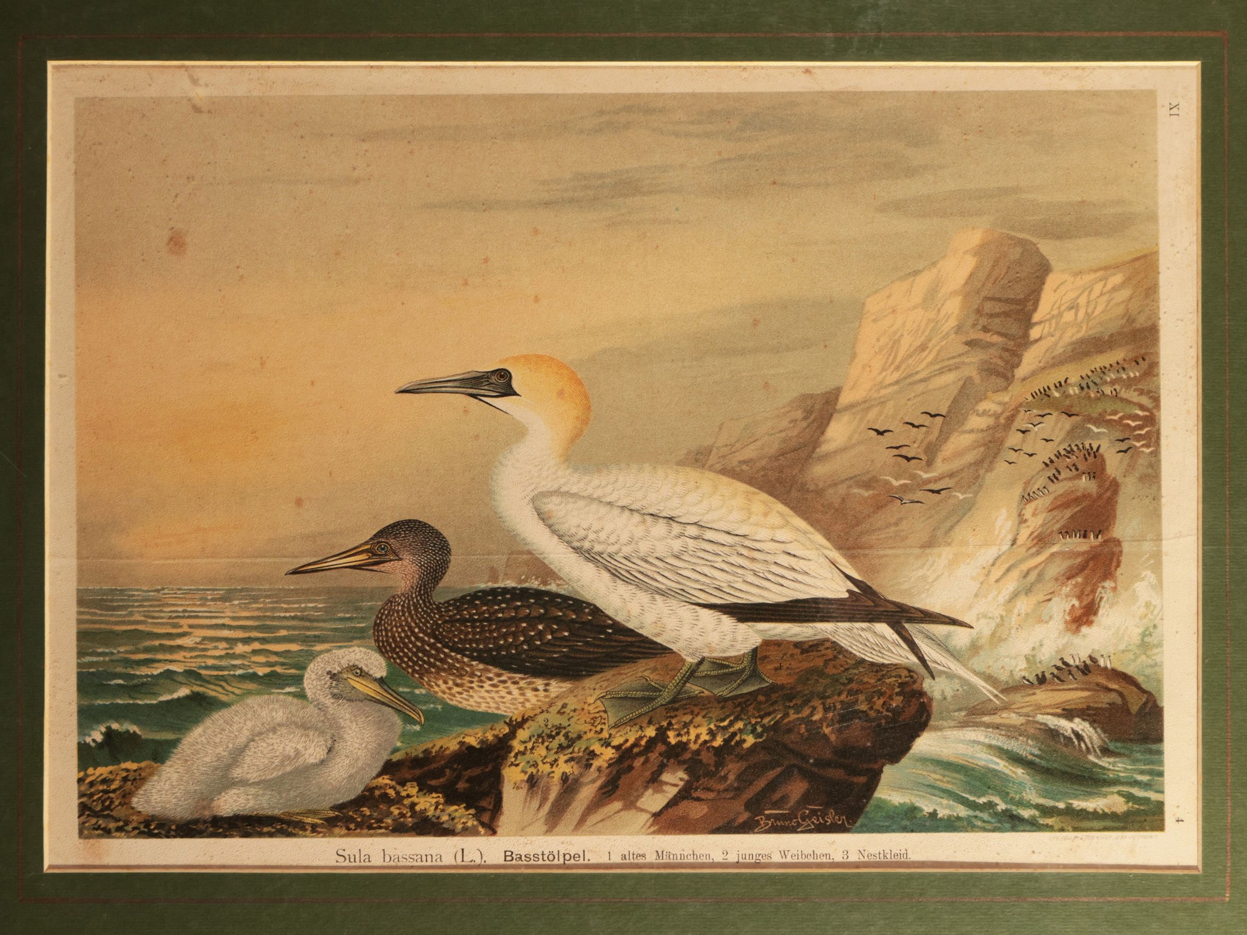 Fine del XIX secolo sei litografie con passe-partout raffiguranti varie specie di uccelli, lievi tracce di foxing