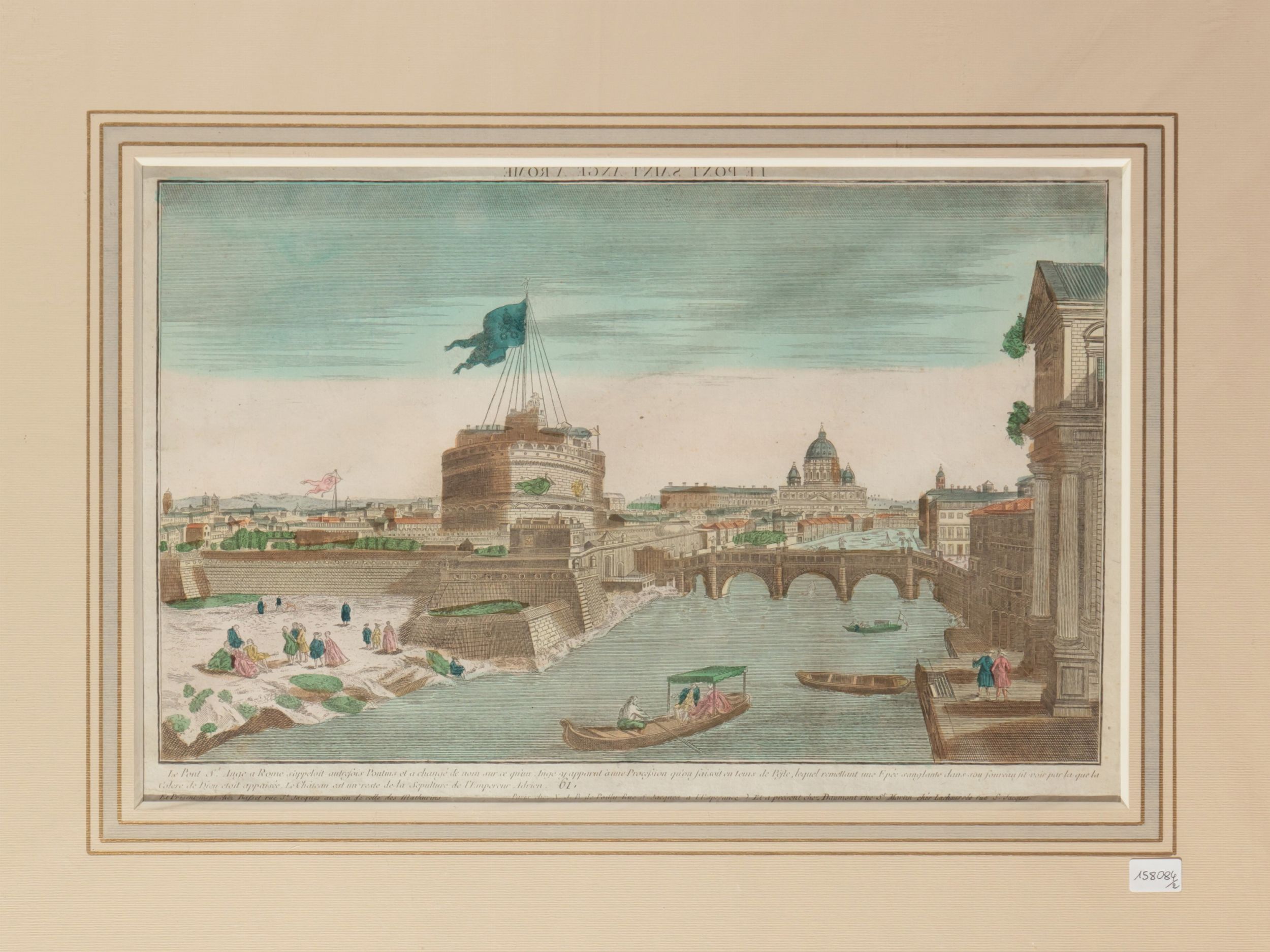 XVIII secolo due vue d'optique all'acquaforte, acquerellate, con passe-partout, lievi tracce di foxing