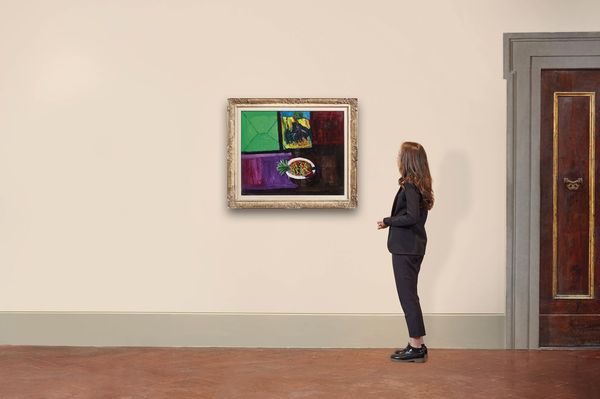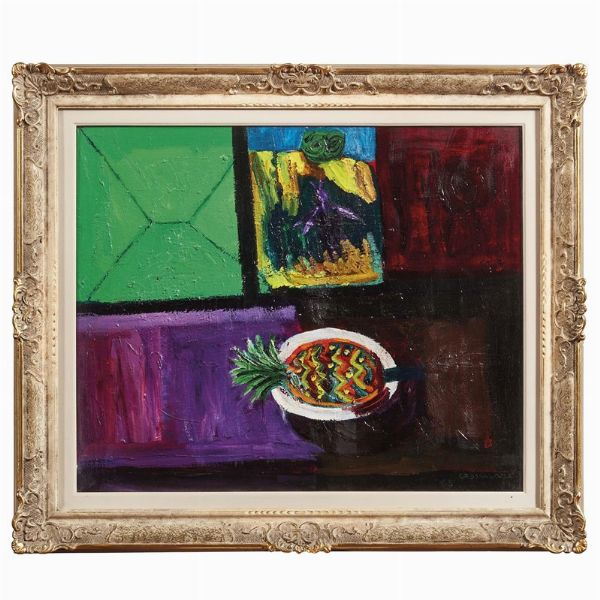 BRUNO CASSINARI (Piacenza 1912 - Milano 1992) Natura morta 1965 olio su tela cm 60x73 firmato in basso a destra al retro firmato, datato e titolato al retro dedicato “A Ennio Sala / con simpatia / Cassinari” al retro due schizzi di volto femminiele al retro timbro illegibile Galleria