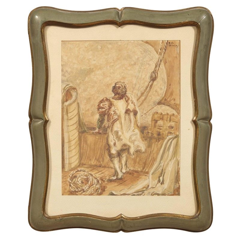 GIORGIO DE CHIRICO (Volos 1888 - Roma 1978) Illustrazione per La via di Colombo di M. Bontempelli 1940 acquerello su carta cm 24,2x18,4 firmato in alto a destra