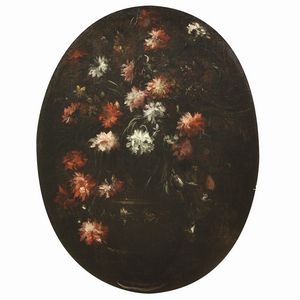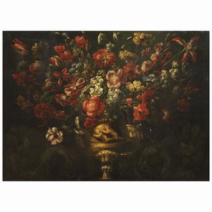 Scuola dell'Italia centrale. sec. XVII COMPOSIZIONE FLOREALE ENTRO VASO SBALZATO olio su tela, cm 91,5x122,5 [..]