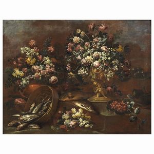 Scuola dell'Italia settentrionale, sec. XVIII COMPOSIZIONI FLOREALI CON PESCI E VOLATILI coppia di dipinti, olio [..]