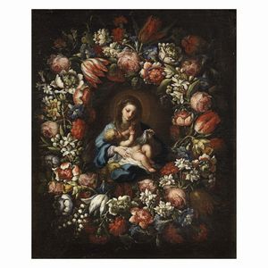 Scuola romana, sec. XVII MADONNA COL BAMBINO ENTRO GHIRLANDA DI FIORI olio su tela, cm 45x36 Roman school, 17th [..]