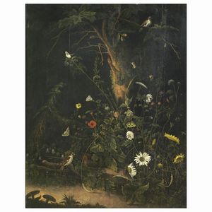 Scuola nord Europea, sec. XVIII SOTTOBOSCO CON FIORI E VOLATILI olio su tavola, cm 90x68 North European school, [..]