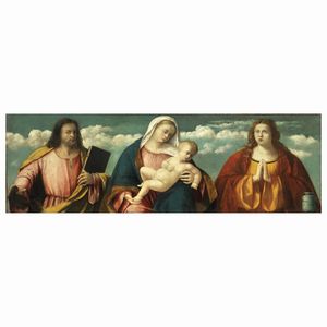 Scuola veneta, sec. XVI MADONNA CON BAMBINO TRA SAN GIOVANNI EVANGELISTA E MARIA MADDALENA olio su tela, cm 46x141 [..]