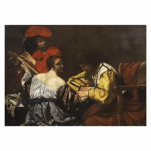 Artista caravaggesco, sec. XVII SCENA DI CONCERTO CON MUSICI olio su tela, cm 120x167 Caravaggesque artist, [..]