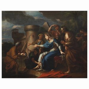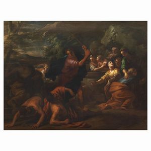 Scuola romana, sec. XVIII MOSE' DIFENDE LE FIGLE DI JETRO olio su tela, cm 91x114,5 Roman school, 18th century [..]