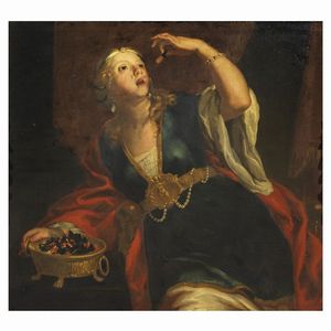 Scuola veneta, sec. XVIII GIUDITTA CON LA TESTA DI OLOFERNE DALILA CON LA CIOCCA DI CAPELLI coppia di dipinti, [..]