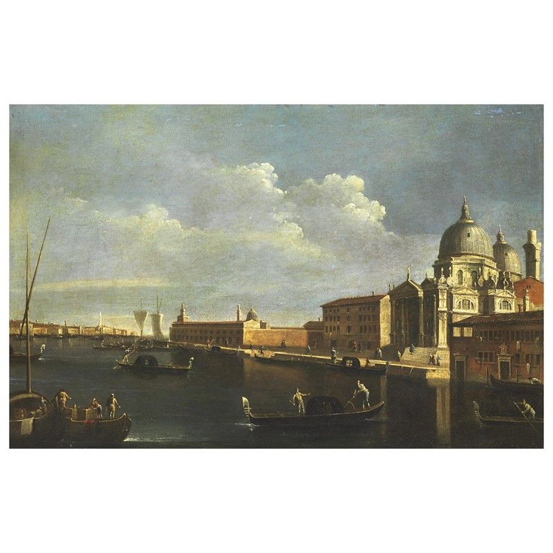 This view of the easternmost stretch of the Grand Canal before it opens onto the Bacino di San Marco is one of the most celebrated in the repertoire of Venetian view painting in the eighteenth century, the composition is borrowed, with variations, from an etching by Luca Carlevarijs, one of the plates in his Le fabriche, e vedute di Venetia disegnate, poste in prospettiva, et intagliate published in 1703. Supported by no fewer than 1,156,627 wooden piles, the church of Santa Maria della Salute is the preeminent Baroque church in Venice. The masterpiece of Baldassarre Longhena (1598-1682), it was begun following a Senate decree of 22 October 1630, in the hope that its construction would result in the deliverance of the city from the plague, a recurrent problem to which it was particularly susceptible, and which killed more than 46.000 people in Venice sixteen months in 1630-31 (hence the church's name, 'Salute' meaning 'healt' or 'salvation'). Longhena was fortunate to live just long enough to the church's completion in 1681. The site, only separated from the Dogana di mare (Maritime Customs House) by the Seminario Patriarcale, was chosen partly because of its proximity to San MArco, San giorno Maggiore and the Redentore. Standing close to the point where the Grand Canal enters the Bacino di San Marco, its towering domes are the focal point for any view down the last stretch of the Gran Canal, as well as for many vistas from the Bacino.