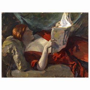 Scuola europea, inizio sec. XX LA LETTURA olio su cartone, cm 30,5x40,5 European school, early 20th century [..]