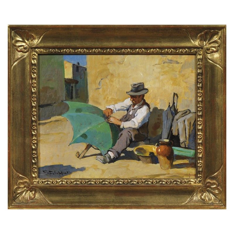 UMBRELLA REPAIRMAN oil on hardboard, 25x30 cm signed lower left on the reverse: label of authenticity signed by Antonio Parronchi