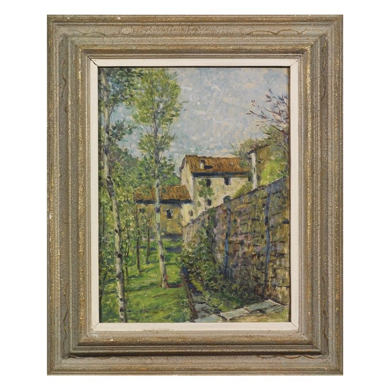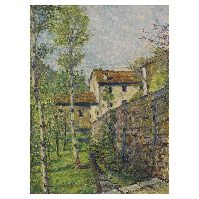 Galileo Chini (Firenze 1873 - 1956) IL MULINO DELLA MERLAIA olio su cartone, cm 33,5x25,5 retro: dedicato “A Giuseppe Nocentini / amico esperto / Galileo Chini in ricordo 9 maggio 44. / (Al 6° allarme di/ loro liberatori)”, cartiglio della Raccolta Nocentini