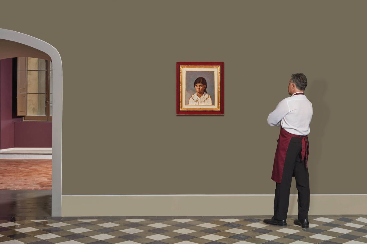 THE MAESTRO FRAZZI'S DAUGHTER oil on card, 35x43 cm signed upper right on the reverse: label inscribed 80