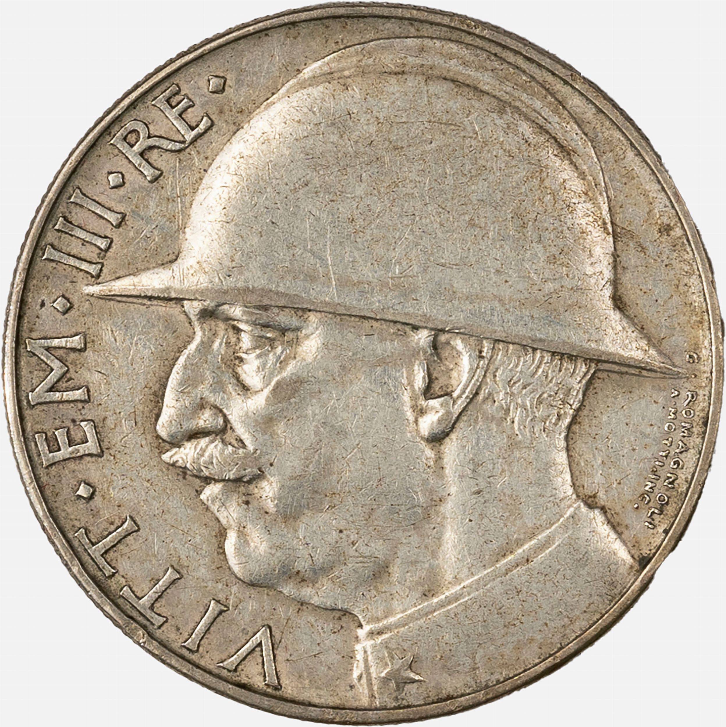 1928 D/ effigie del Re a sinistra in uniforme e con elmetto di ordinanza R/ fascio littorio, leone e scure su cui campeggia un motto, Zecca di Roma; Metallo: AR. qBB
