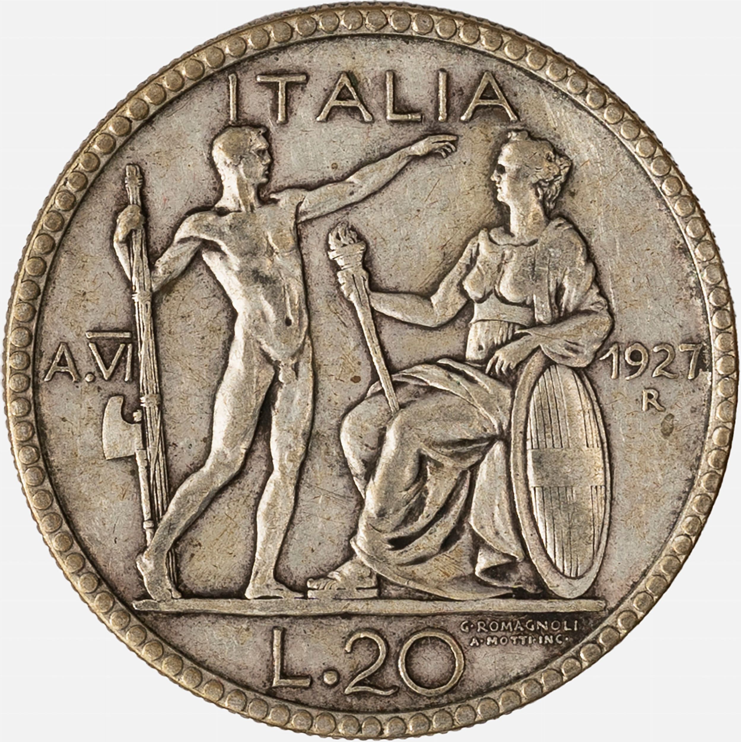 1927 D/ effigie del Re a destra R/ littore con fascio nella mano destra saluta romanamente l'Italia seduta con fiaccola e scudo sabaudo, Zecca di Roma; Metallo: AR. qBB