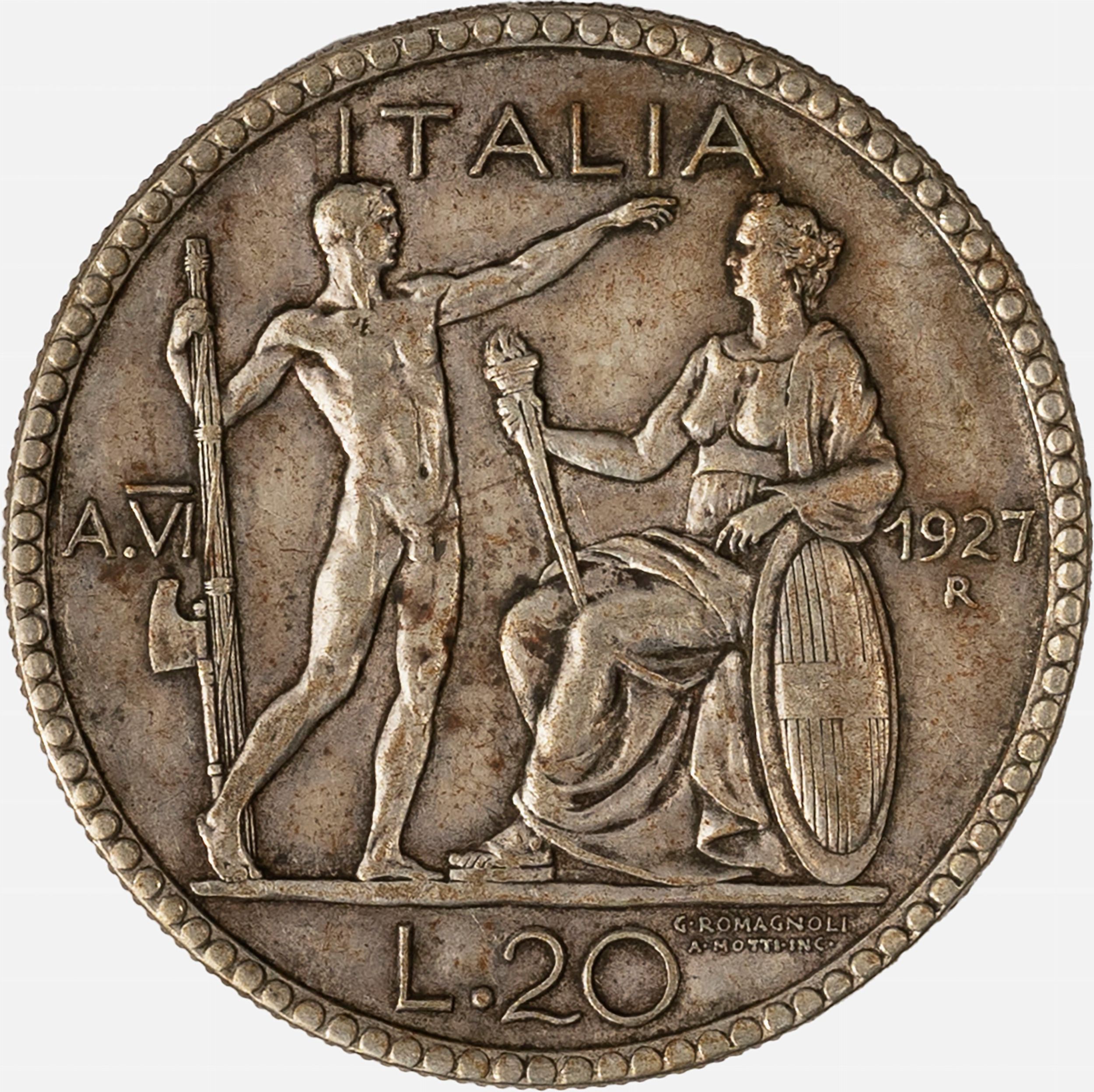 1927 D/ effigie del Re a destra R/ littore con fascio nella mano destra saluta romanamente l'Italia seduta con fiaccola e scudo sabaudo, Zecca di Roma; Metallo: AR. qBB