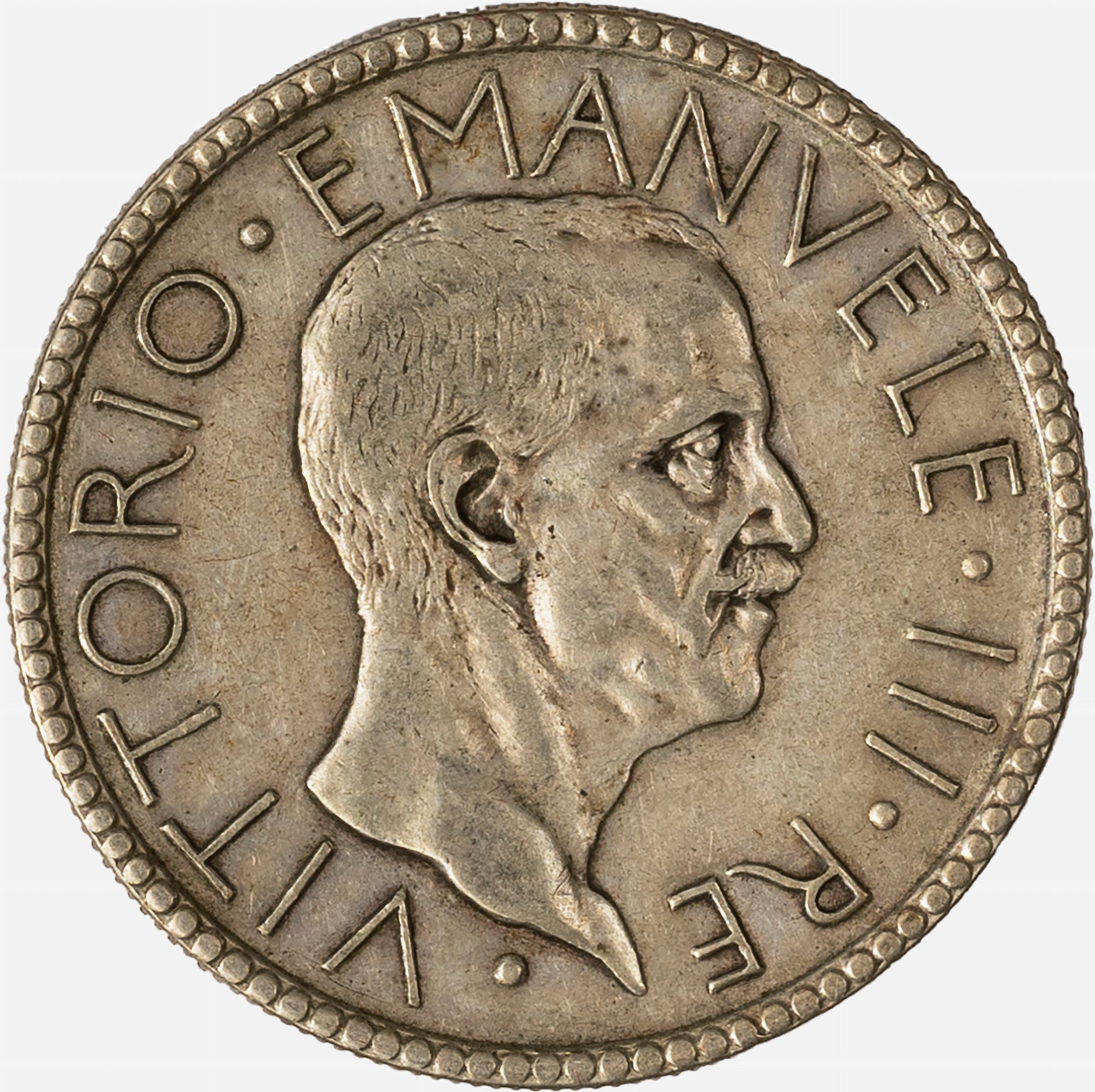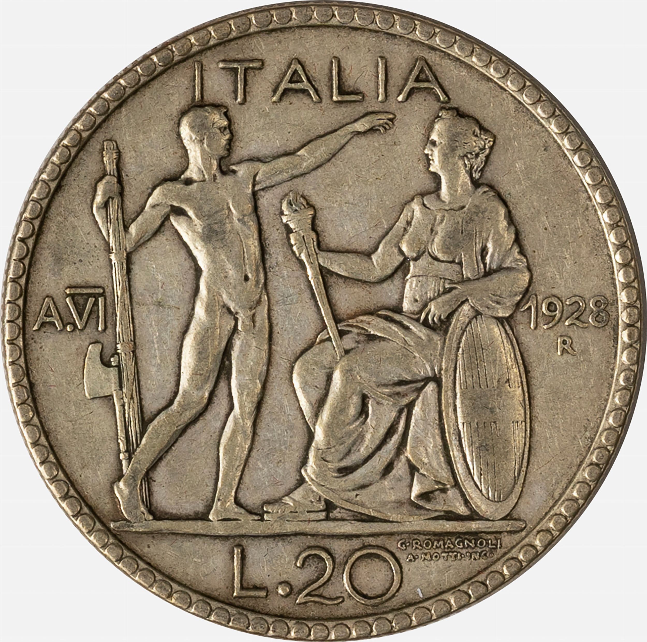 1928 D/ effigie del Re a destra R/ littore con fascio nella mano destra saluta romanamente l'Italia seduta con fiaccola e scudo sabaudo, Zecca di Roma; Metallo: AR. qBB