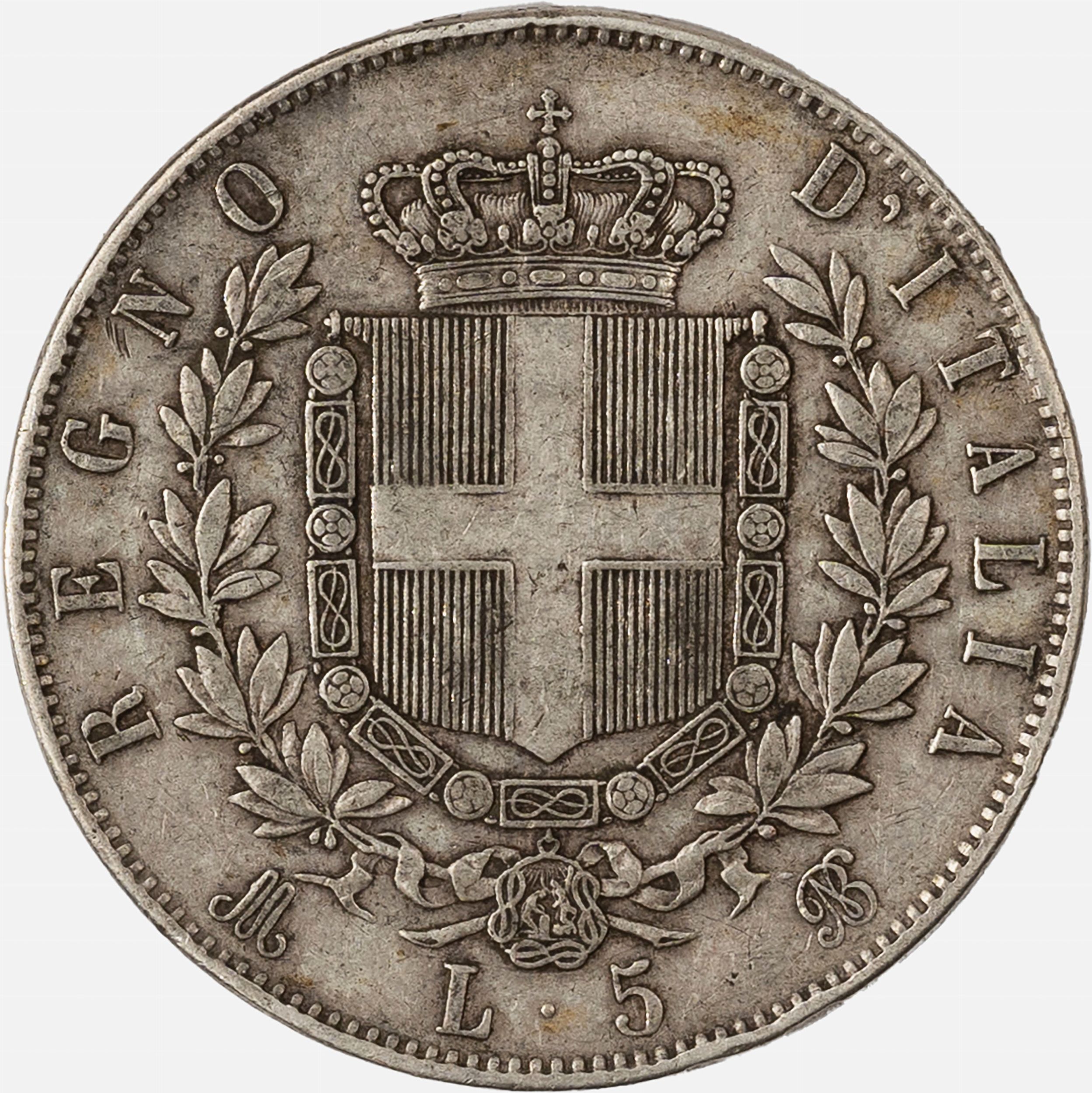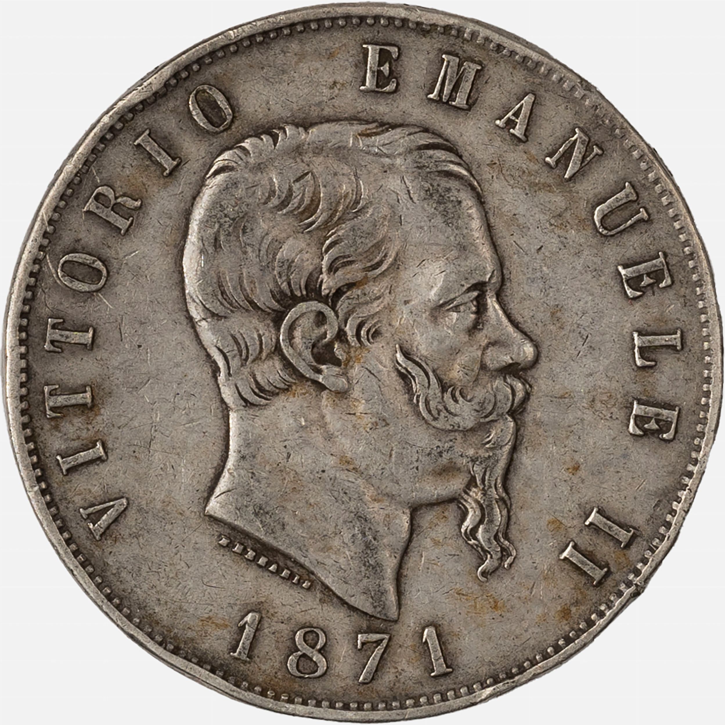1871 D/ effigie del Re a destra R/ stemma di Casa Savoia coronato e circondato dal Collare dell'Annunziata; Metallo: AR. qBB