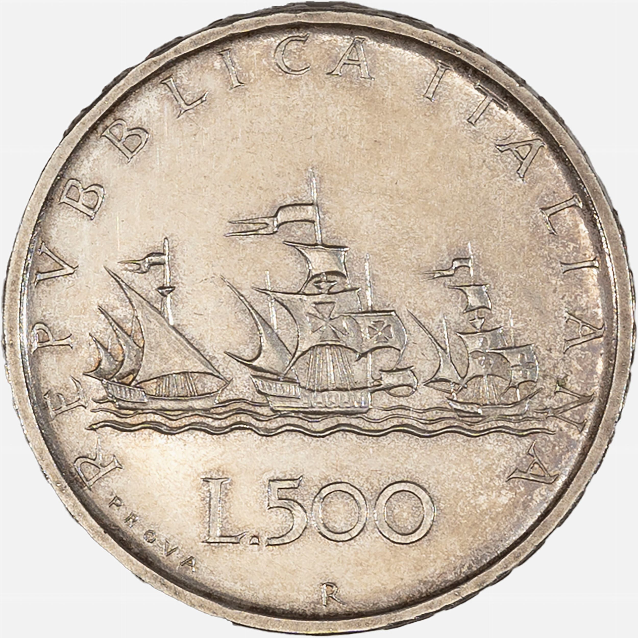 1957 D/ busto muliebre di ispirazione rinascimentale a s. R/ tre caravelle naviganti verso destra con vento in poppa ma con il vessillo dell'albero maestro dispiegato contro vento e con la scritta PROVA lungo il bordo, Zecca di Roma; Metallo: AV, gr. 10,99, Diam: mm. 29,18. SPL. Con bustina originale della Zecca dello Stato.