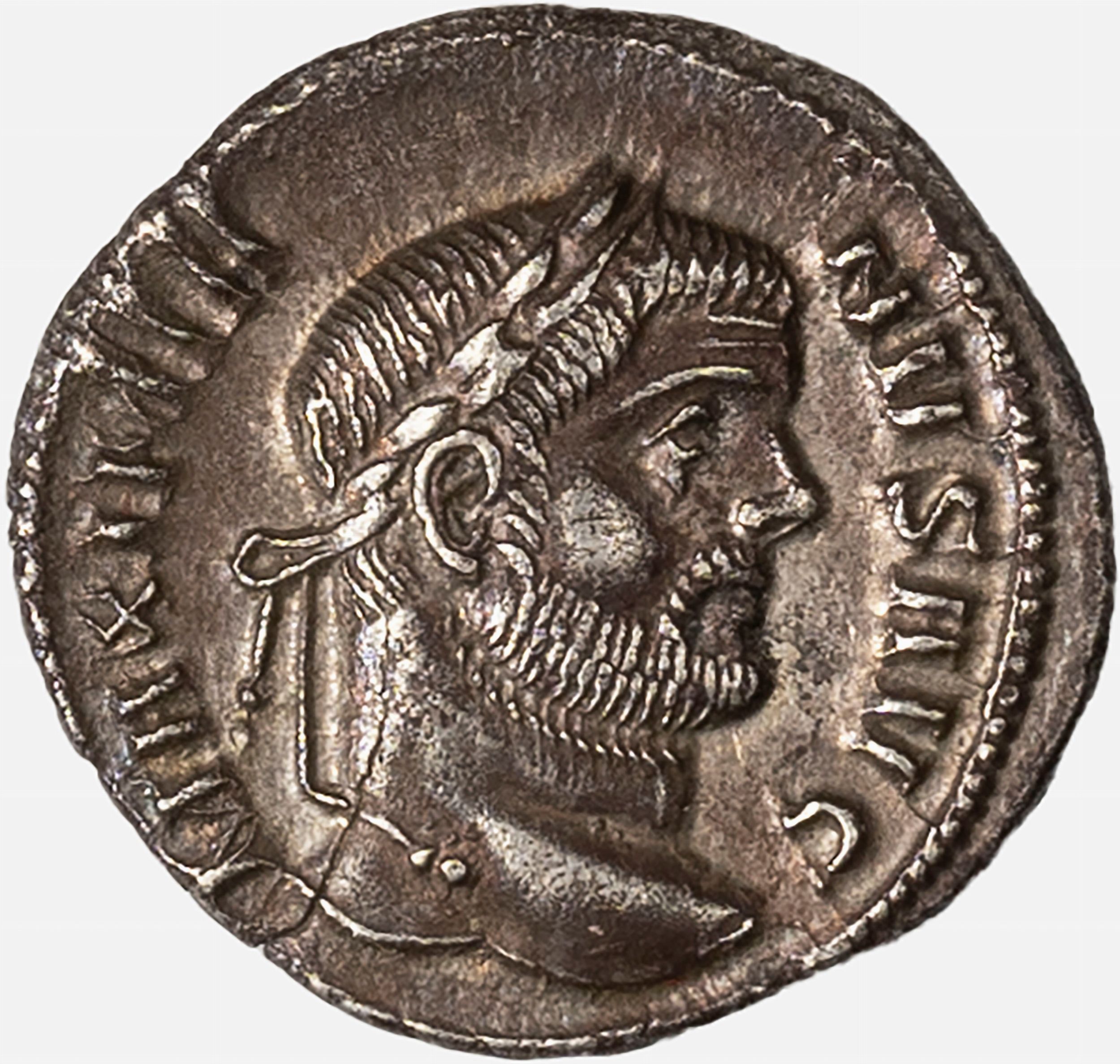 D/ testa barbuta e laureata dell'Imperatore a d., R/ i quattro Tetrarchi stanti sacrificano su un tripode posto all’ingresso di una fortificazione con sei torri, Zecca di Ticinum, Rif. bibl. RIC VI Ticinum 14b; Metallo: AR, gr. 2,68, diam. 19 mm., mBB